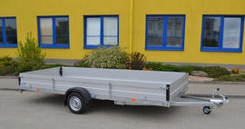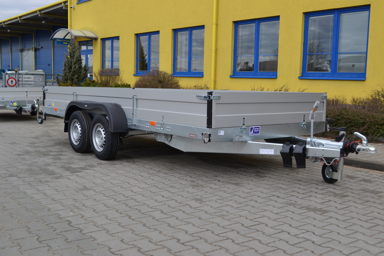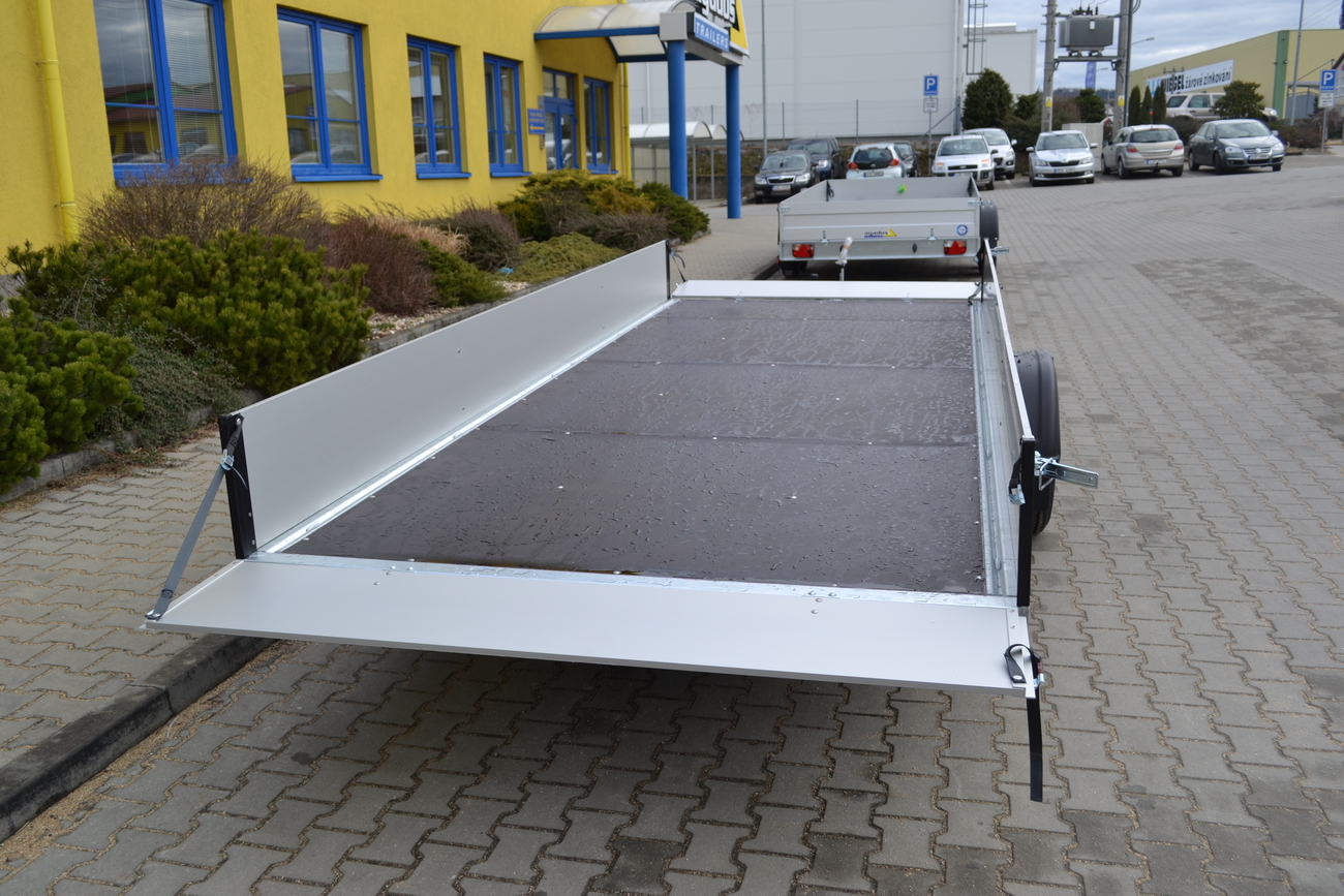 Provedení s "V" ojí, hliníkové bočnice 350 mm, 13" kola, 13pólová elektroinstalace, podlaha je vyrobená z voděodolné překližky o síle 15 mm. Bočnice jsou odnímatelné.