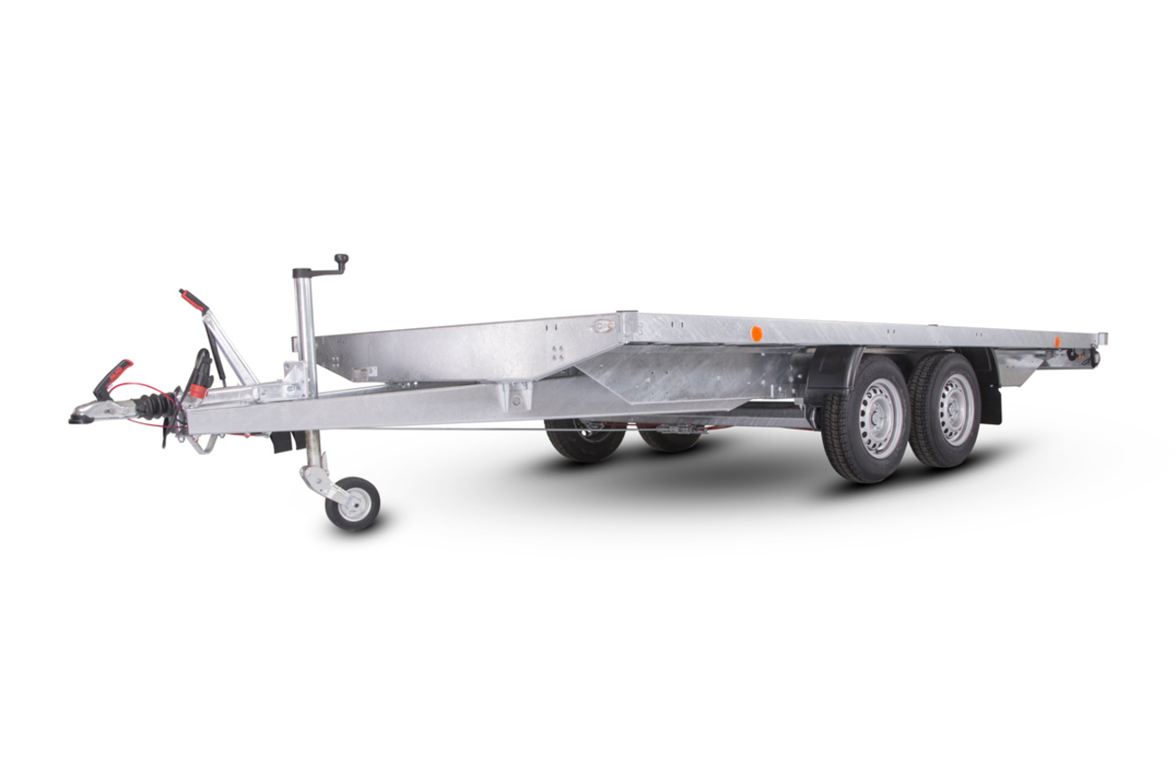 Provedení s "V" ojí, hliníkové bočnice 350 mm, 13" nebo 14" kola. 13pólová elektroinstalace, podlaha je vyrobená z voděodolné překližky o síle 15 mm. Bočnice jsou sklopné a odnímatelné, masivní žebřinový rám ze svařených dílů žárově zinkovaných.
