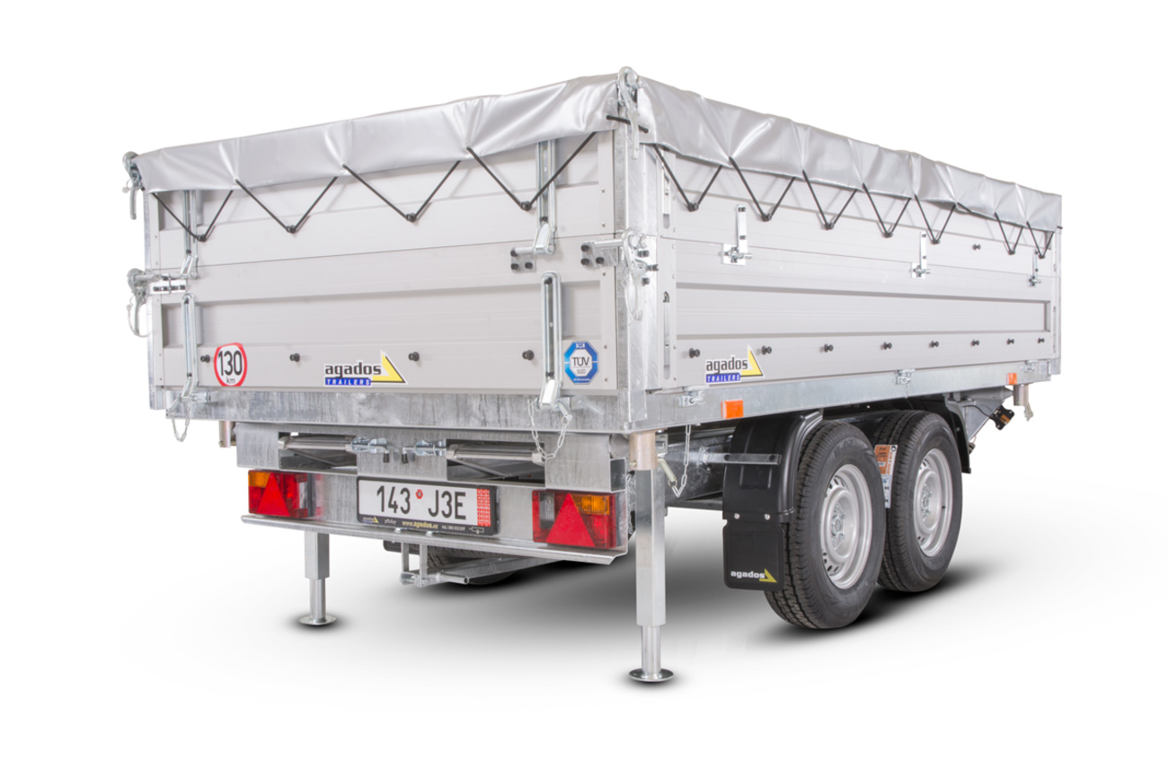 ATLAS series trailers are braked trailers with a total weight up to 3500 kg and with three-side tilting body, 350 mm folding and removable aluminium side boards.