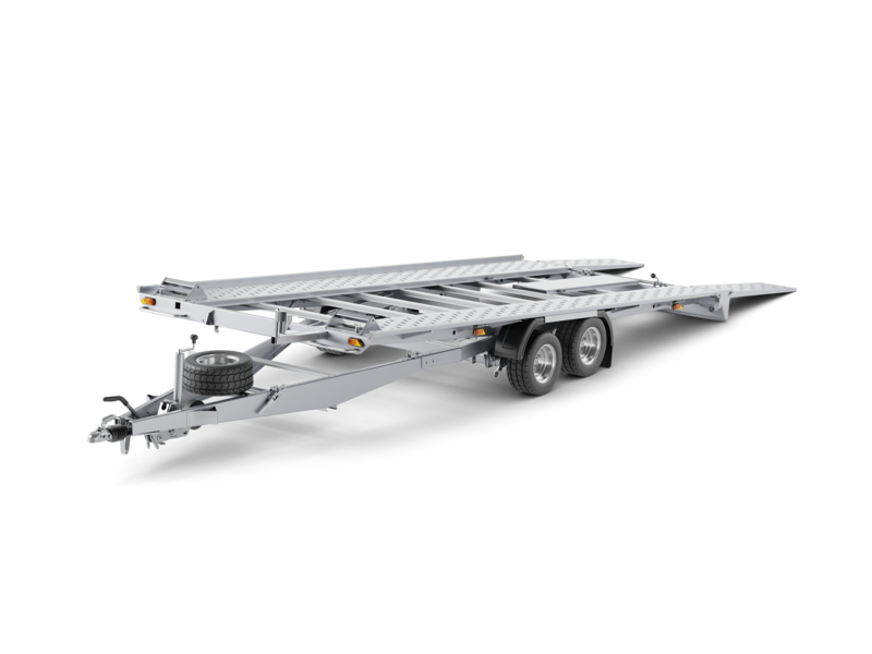 Podlaha tvořená ližinami s předními posuvnými dorazy. Ocelové nájezdy uložené v ložné ploše. Nájezdy lze posouvat po celé šířce přívěsu a mají nájezdový úhel 8°. Příprava na naviják s uchycením na levou i pravou stranu. 10“ kola, 13 pólová instalace. Náprava a brzdový systém od značky KNOTT.