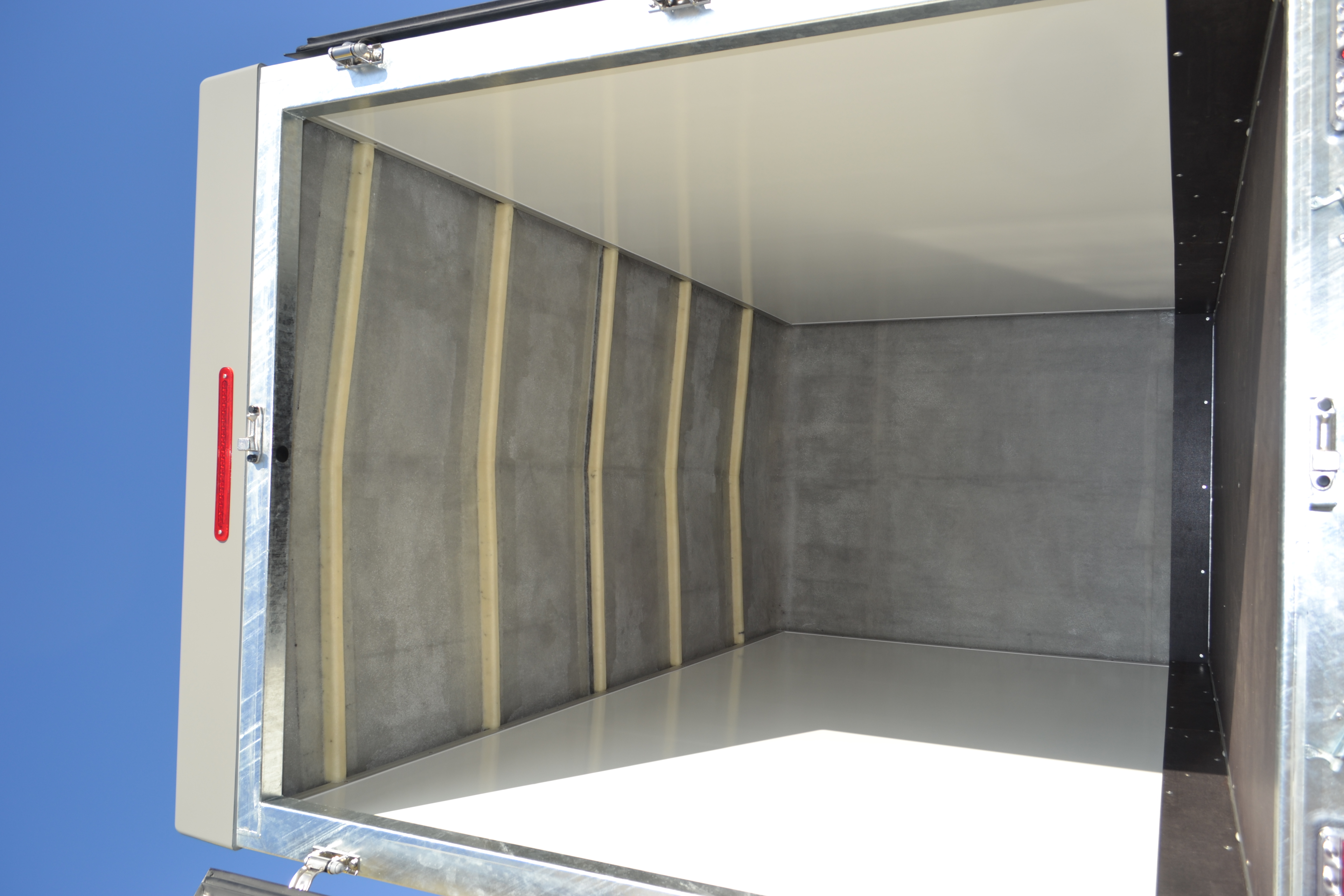 Zadní portál žárově zinkovaný se zadním korytem vcelku. Masivní svařovaný rám podvozku. Uložení nájezdů pod ložnou plochou. Zadní osvětlení osazeno našimi světli AGADOS SMART 12V, třetí brzdové světlo na víku. Přední čelo a střecha je z laminátu v šedé barvě.