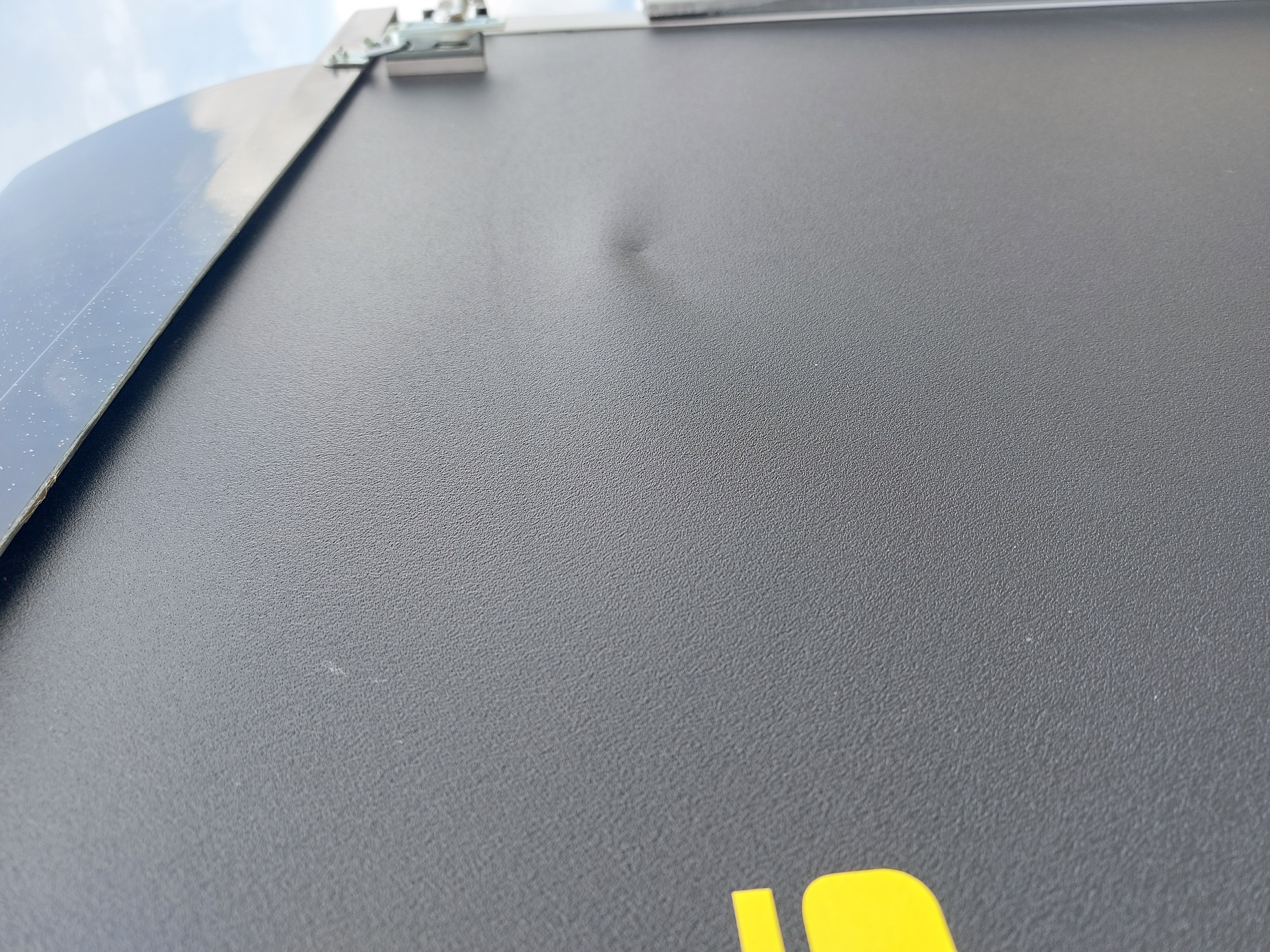 Levá strana - zdutá fólie po celé ploše. Vyvrtané díry v bočnici. Chybí opěrné nohy.