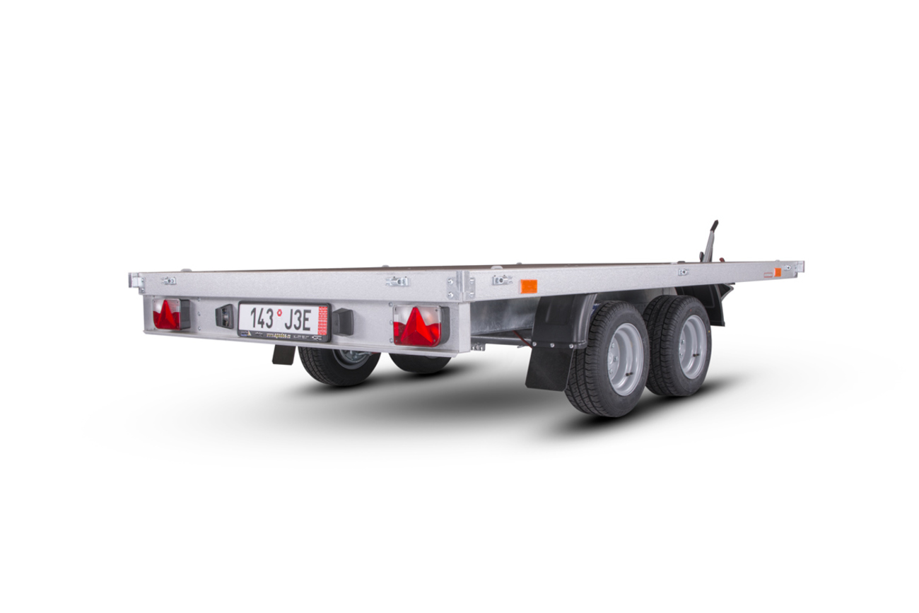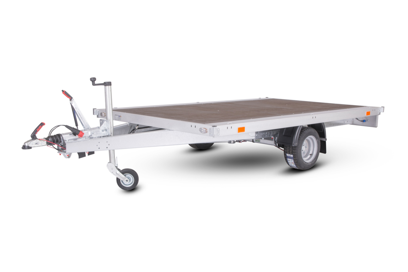 Provedení s "V" ojí, hliníkové bočnice 350 mm, 13" kola, 13pólová elektroinstalace, podlaha je vyrobená z voděodolné překližky o síle 15 mm. Bočnice jsou sklopné a odnímatelné včetně rohových sloupků - lze vytvořit plato.