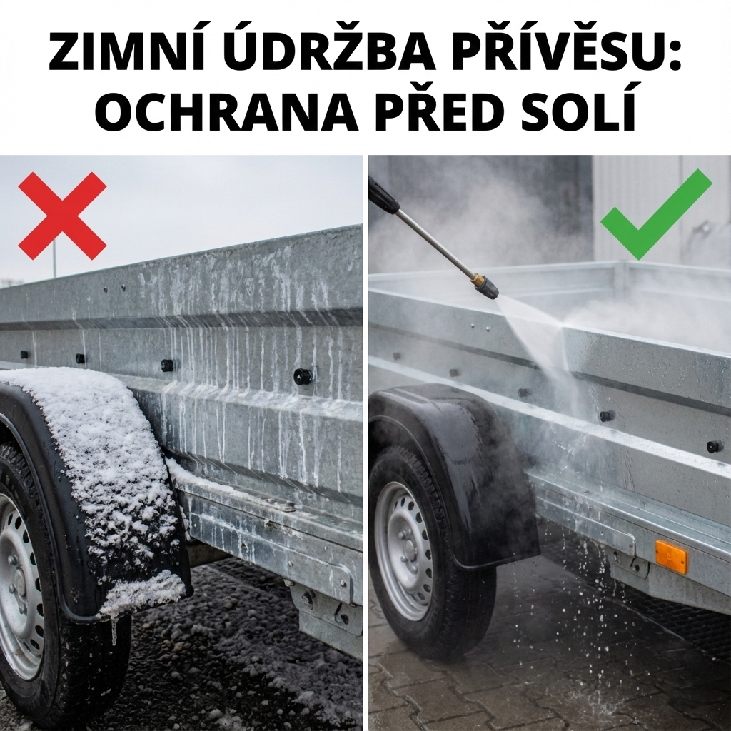 V zimním období se na silnicích nevyhneme posypové soli. Zatímco pro bezpečnost provozu je nezbytná, pro čerstvě pozinkované části nových přívěsů představuje riziko, pokud není včas odstraněna.